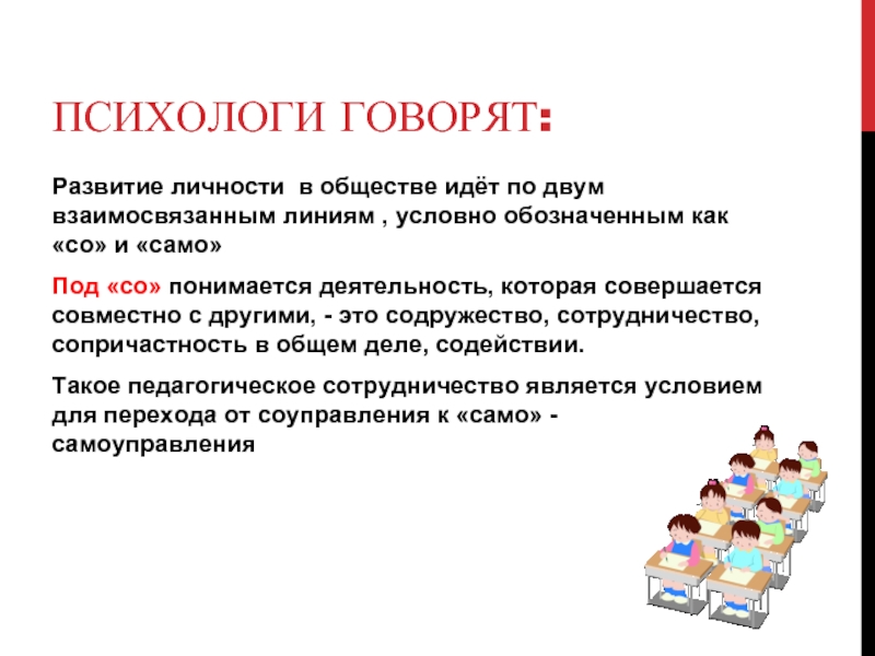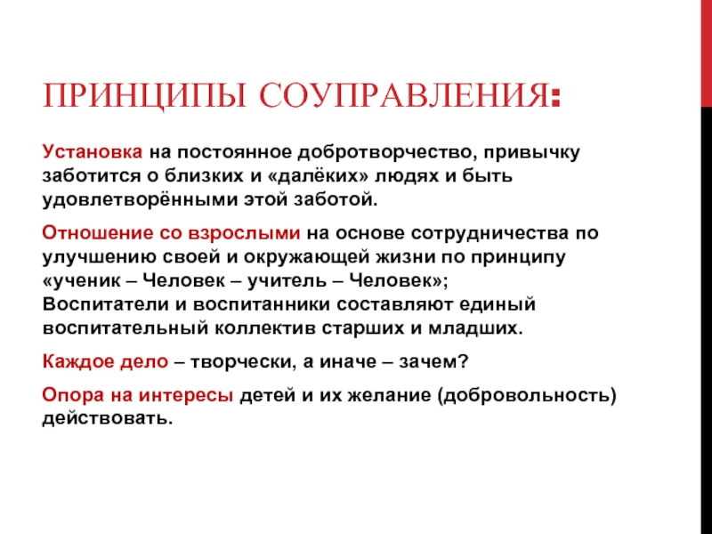 Такое педагогическое сотрудничество является условием для перехода от соуправления к «само» - самоуправления