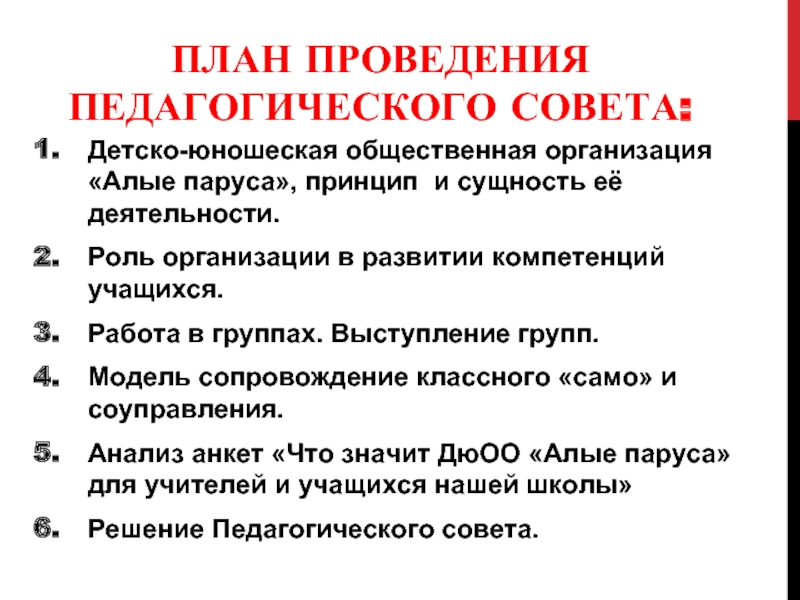 Слайд 2ПЛАН ПРОВЕДЕНИЯ ПЕДАГОГИЧЕСКОГО СОВЕТА: