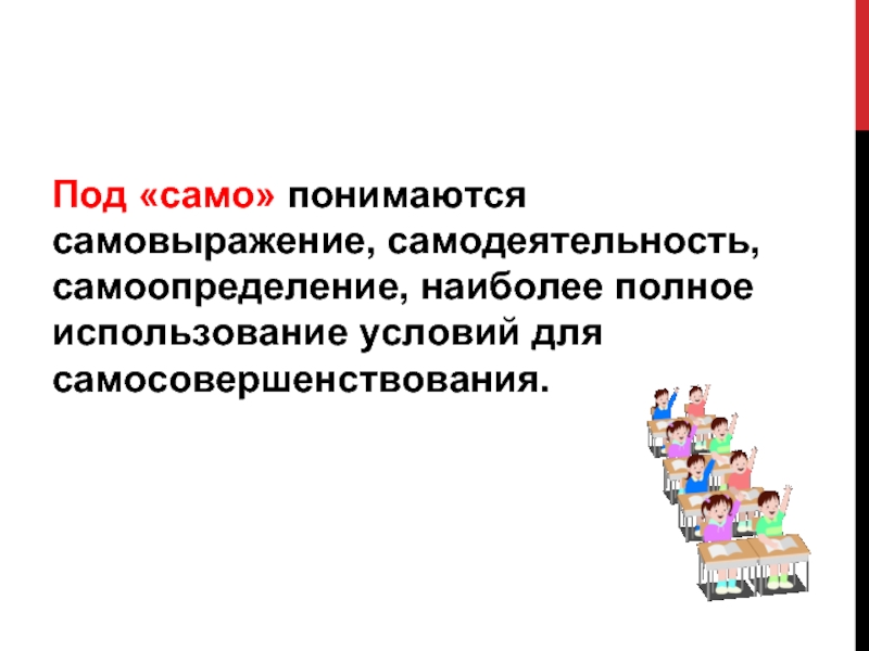 Слайд 14Под «само» понимаются самовыражение, самодеятельность, самоопределение, наиболее полное использование условий для