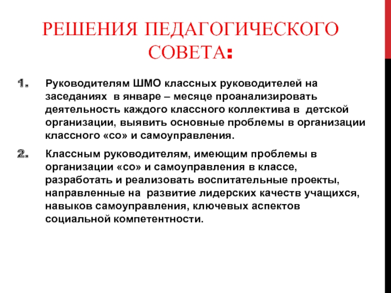Классным руководителям, имеющим проблемы в организации «со» и самоуправления в классе, разработать и реализовать воспитательные проекты, направленные на развитие лидерских качеств учащихся, навыков самоуправления, ключевых аспектов социальной компетентности.