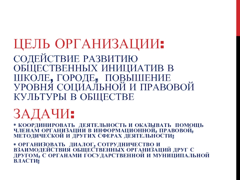 • КООРДИНИРОВАТЬ ДЕЯТЕЛЬНОСТЬ И ОКАЗЫВАТЬ ПОМОЩЬ ЧЛЕНАМ ОРГАНИЗАЦИИ В ИНФОРМАЦИОННОЙ, ПРАВОВОЙ, МЕТОДИЧЕСКОЙ И ДРУГИХ СФЕРАХ ДЕЯТЕЛЬНОСТИ;