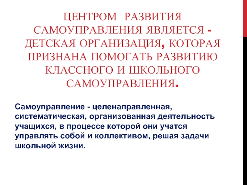 Слайд 16ЦЕНТРОМ РАЗВИТИЯ САМОУПРАВЛЕНИЯ ЯВЛЯЕТСЯ - ДЕТСКАЯ ОРГАНИЗАЦИЯ, КОТОРАЯ ПРИЗНАНА ПОМОГАТЬ РАЗВИТИЮ