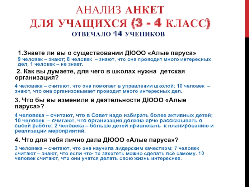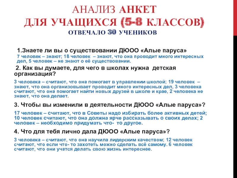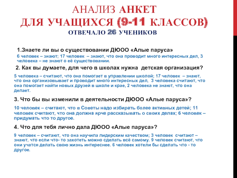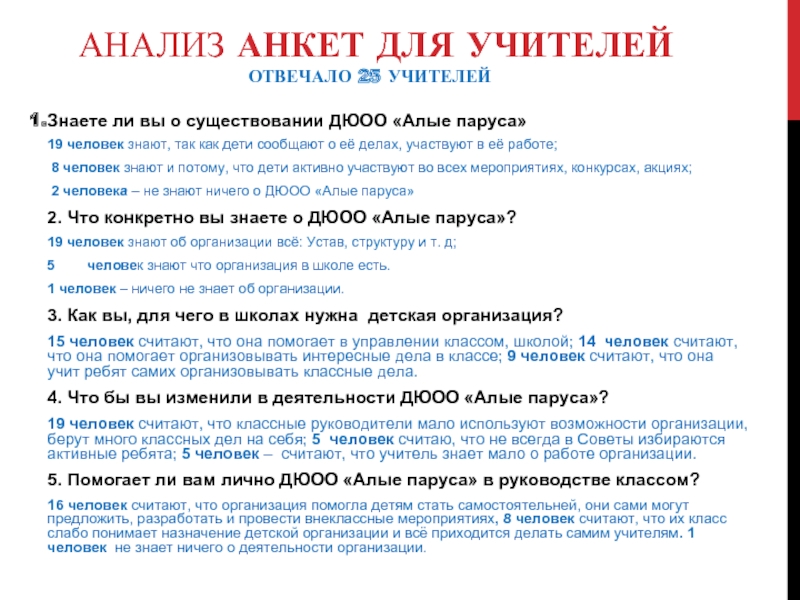 Анализ анкет «Что значит ДюОО «Алые паруса» для учителей и учащихся нашей школы»