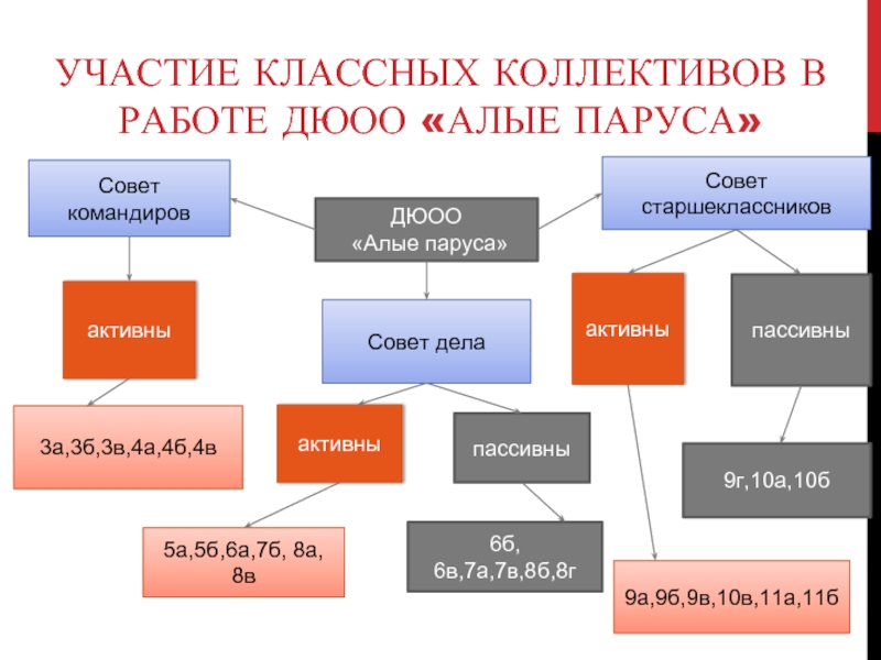 Слайд 31УЧАСТИЕ КЛАССНЫХ КОЛЛЕКТИВОВ В РАБОТЕ ДЮОО «АЛЫЕ ПАРУСА»