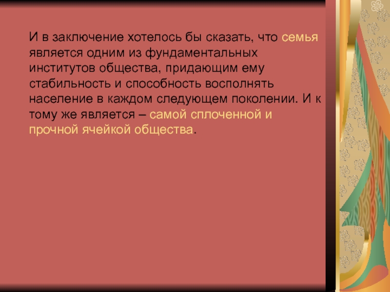 фундаментальных институтов общества, придающим ему стабильность и способность восполнять население в каждом следующем поколении. И к тому же является – самой сплоченной и прочной ячейкой общества.