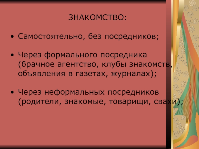 Через неформальных посредников (родители, знакомые, товарищи, свахи);