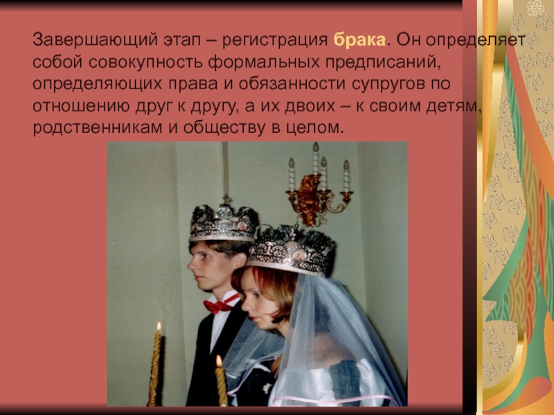 Завершающий этап – регистрация брака. Он определяет собой совокупность формальных предписаний,