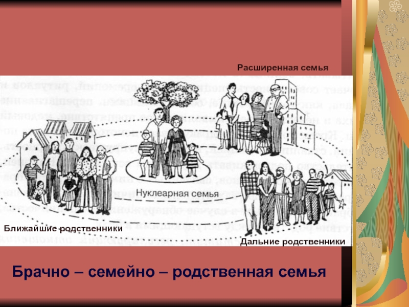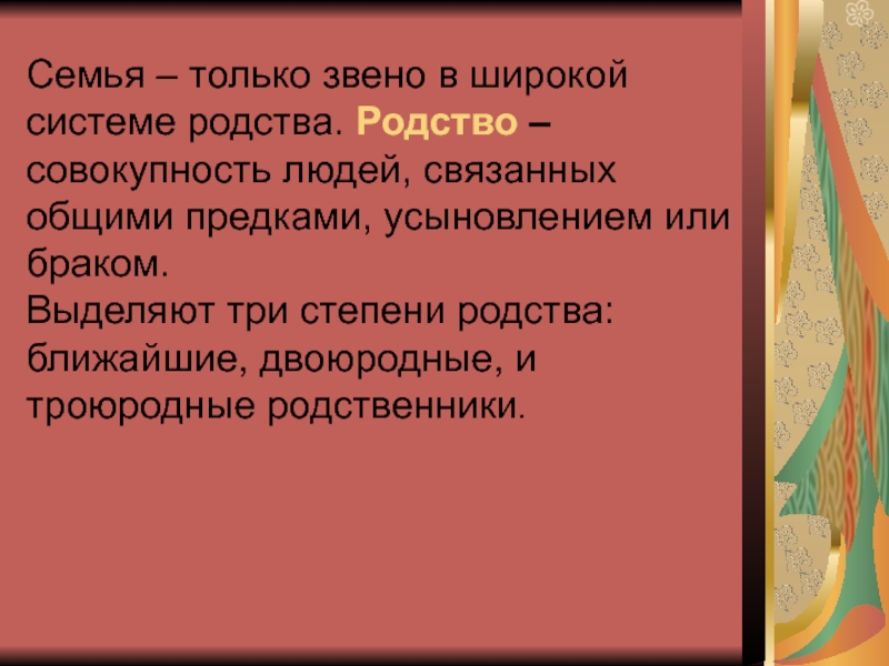 Слайд 6Семья – только звено в широкой системе родства. Родство –совокупность людей,