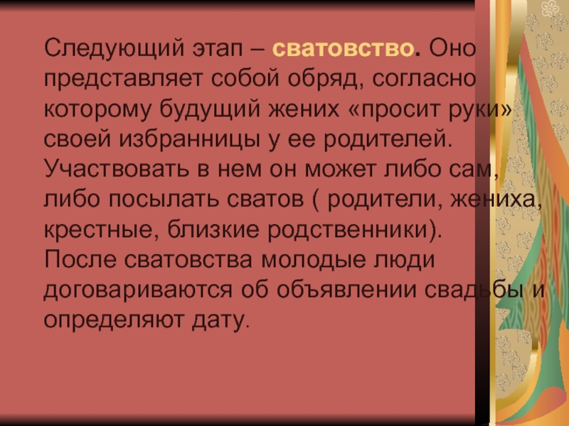 Слайд 13Следующий этап – сватовство. Оно представляет собой обряд, согласно которому будущий