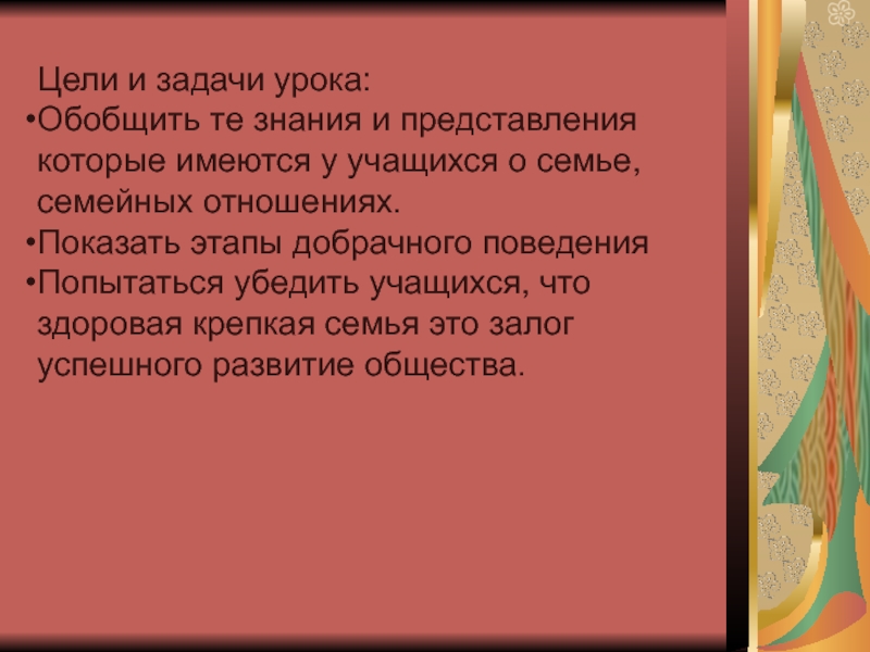 Попытаться убедить учащихся, что здоровая крепкая семья это залог успешного развитие общества.