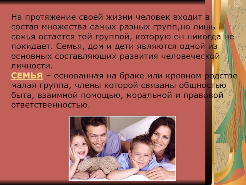 групп,но лишь семья остается той группой, которую он никогда не покидает. Семья, дом и дети являются одной из основных составляющих развития человеческой личности.