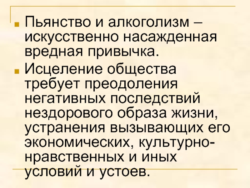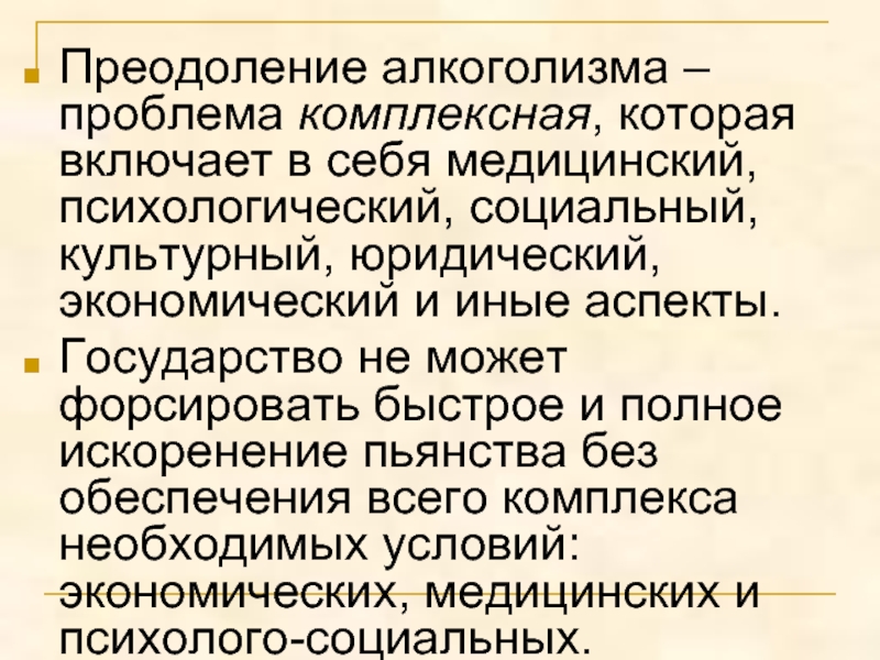 Государство не может форсировать быстрое и полное искоренение пьянства без обеспечения всего комплекса необходимых условий: экономических, медицинских и психолого-социальных.