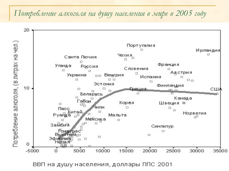 Слайд 8Потребление алкоголя на душу населения в мире в 2005 году