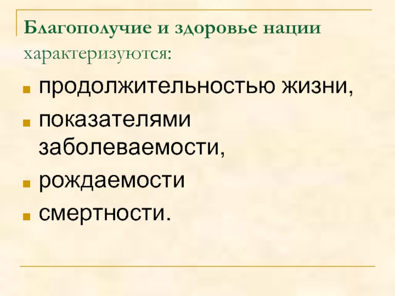 Слайд 10Благополучие и здоровье нации характеризуются: