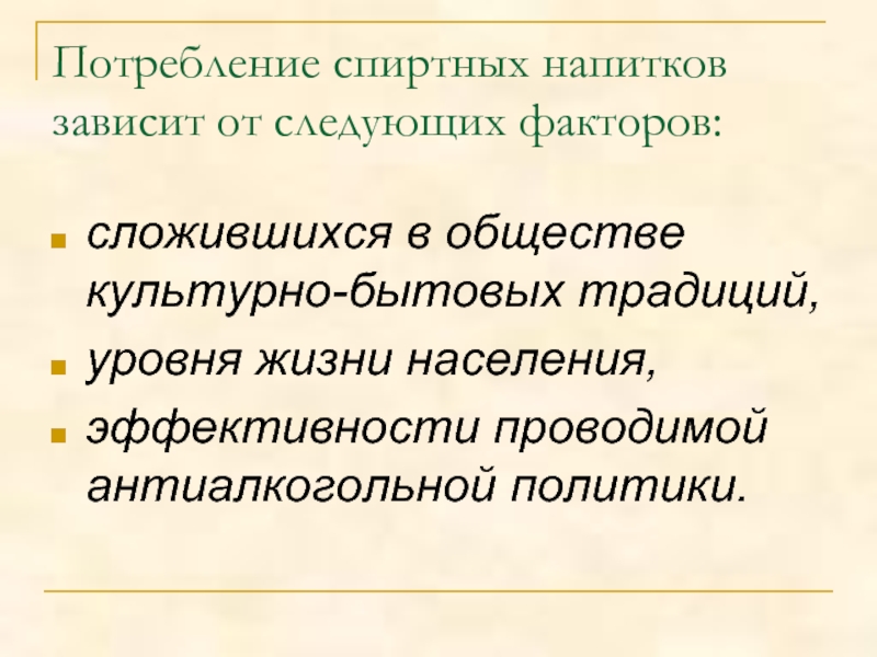 Слайд 5Потребление спиртных напитков зависит от следующих факторов: