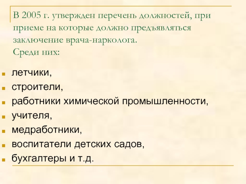 Слайд 20В 2005 г. утвержден перечень должностей, при приеме на которые должно