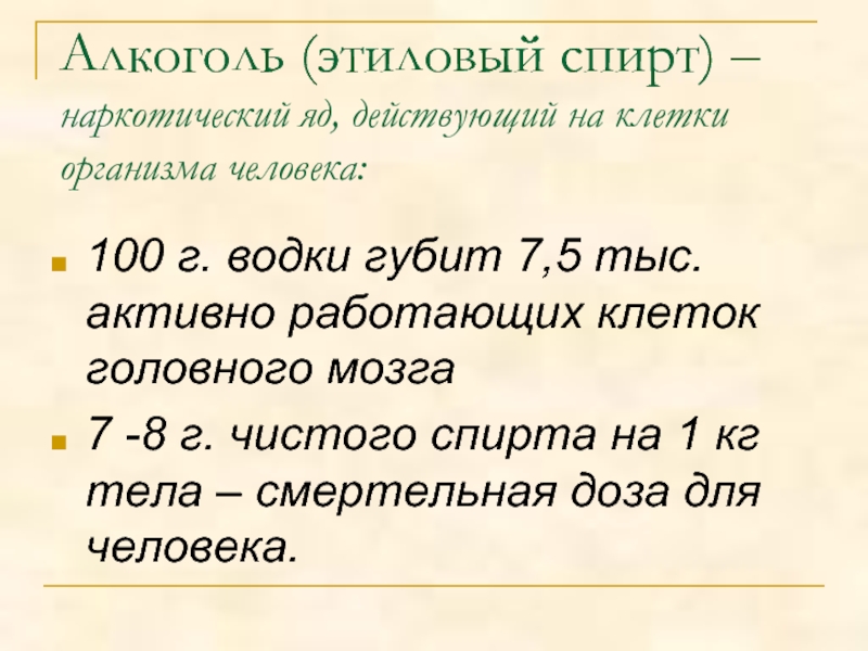 7 -8 г. чистого спирта на 1 кг тела – смертельная доза для человека.