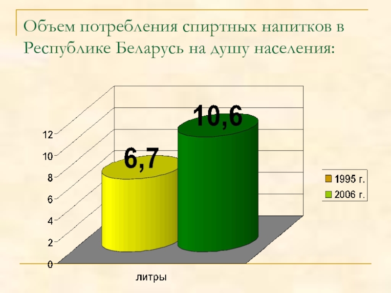 Слайд 7Объем потребления спиртных напитков в Республике Беларусь на душу населения: