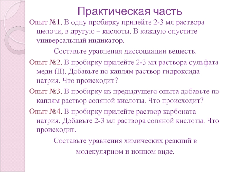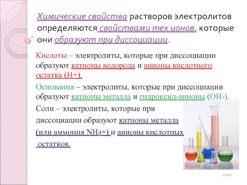 Кислоты – электролиты, которые при диссоциации образуют катионы водорода и анионы кислотного остатка (Н+).