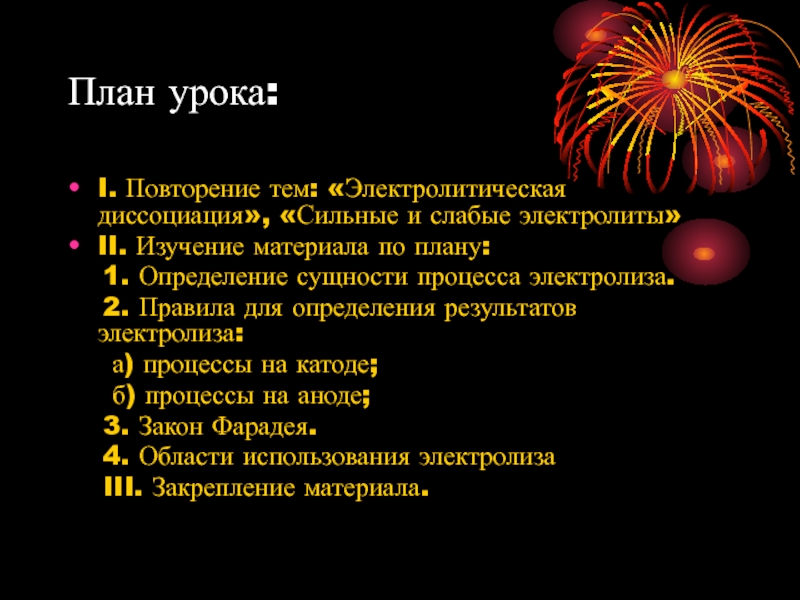 I. Повторение тем: «Электролитическая диссоциация», «Сильные и слабые электролиты»