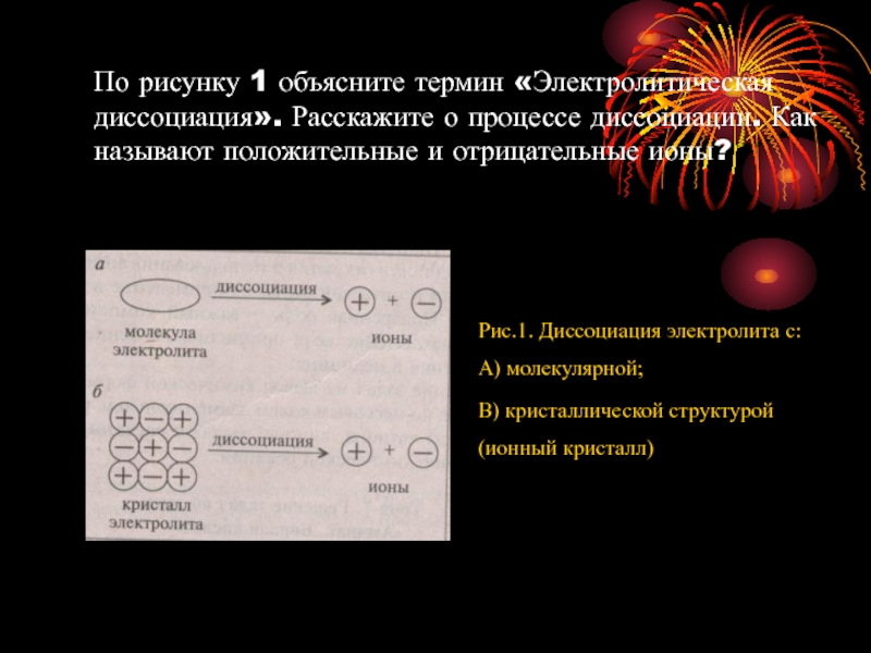 Слайд 5По рисунку 1 объясните термин «Электролитическая диссоциация». Расскажите о процессе диссоциации.