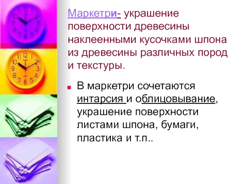 В маркетри сочетаются интарсия и облицовывание, украшение поверхности листами шпона, бумаги, пластика и т.п..