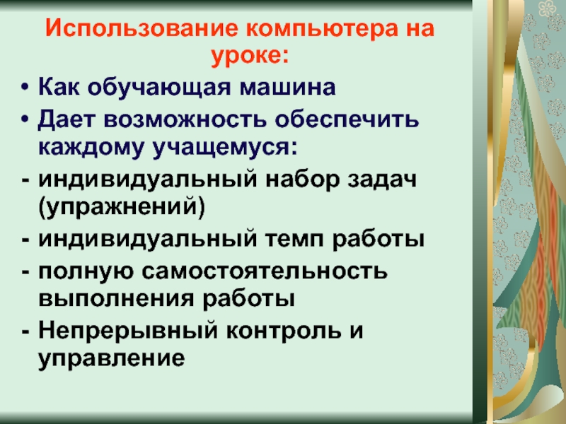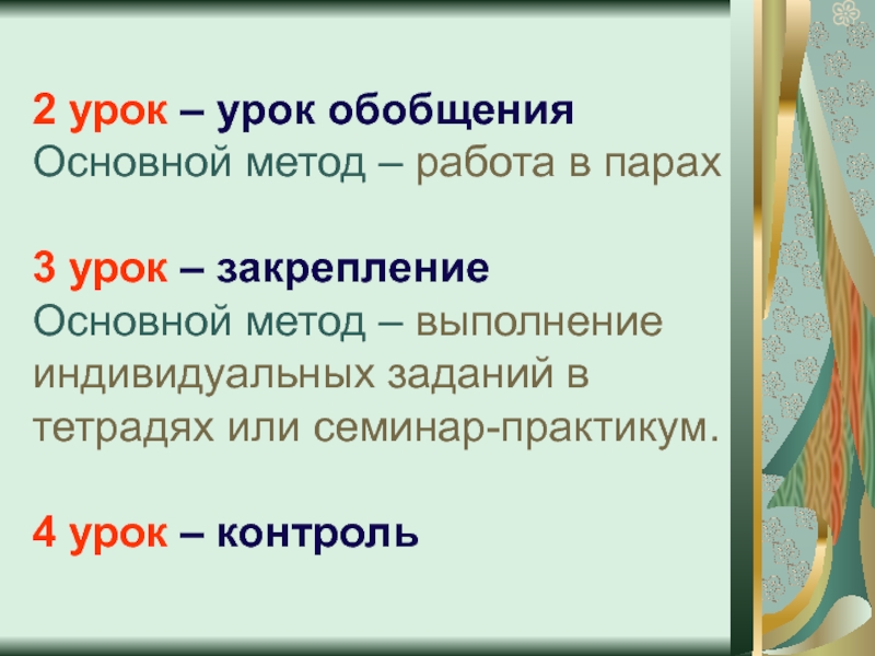 Основной метод – выполнение индивидуальных заданий в тетрадях или семинар-практикум.