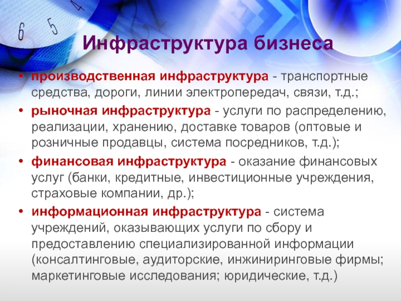 финансовая инфраструктура - оказание финансовых услуг (банки, кредитные, инвестиционные учреждения, страховые компании, др.);