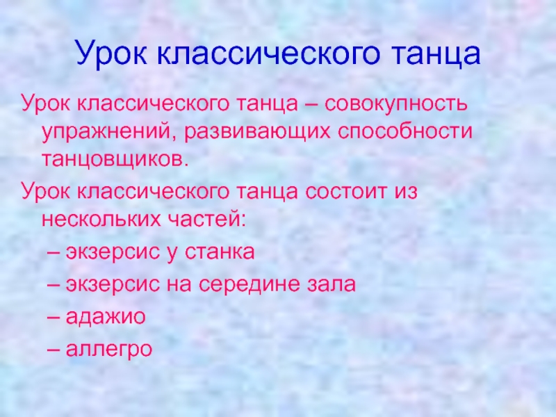 Урок классического танца – совокупность упражнений, развивающих способности танцовщиков.