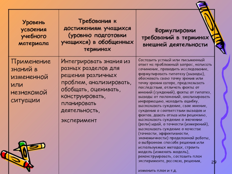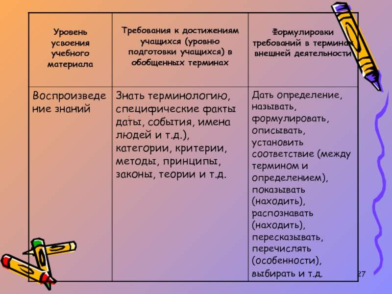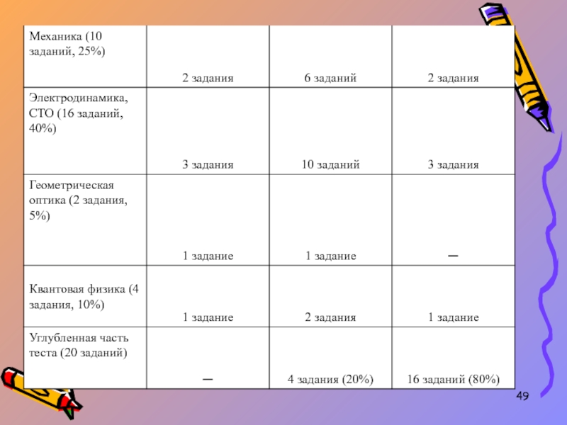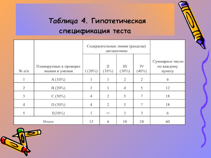 При создании теста ставится задача отобразить в его содержании то главное, что должны знать ученики в результате обучения, поэтому ограничиться простым перечислением целей обучения нельзя.