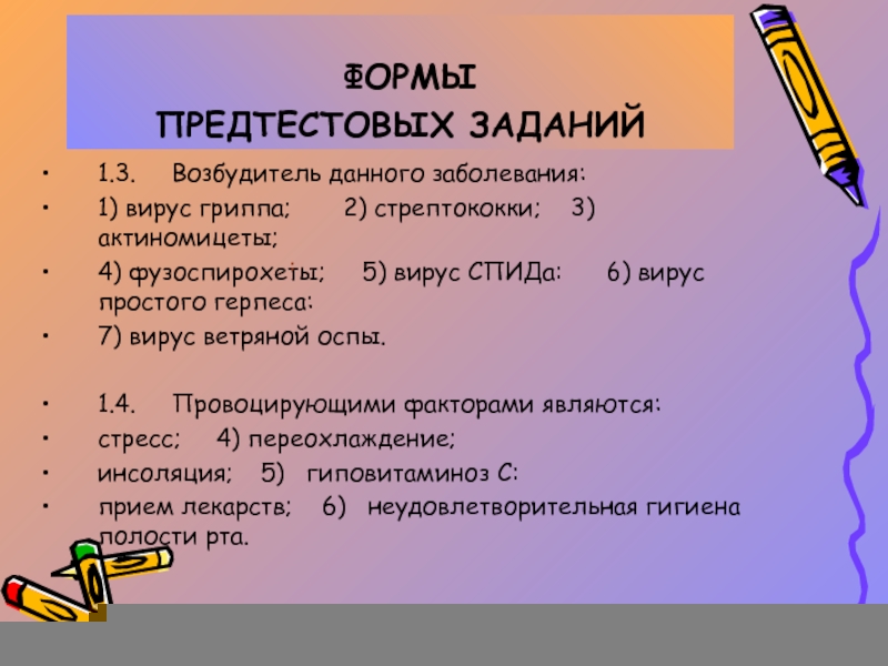 4) фузоспирохеты;   5) вирус СПИДа:   6) вирус простого герпеса: