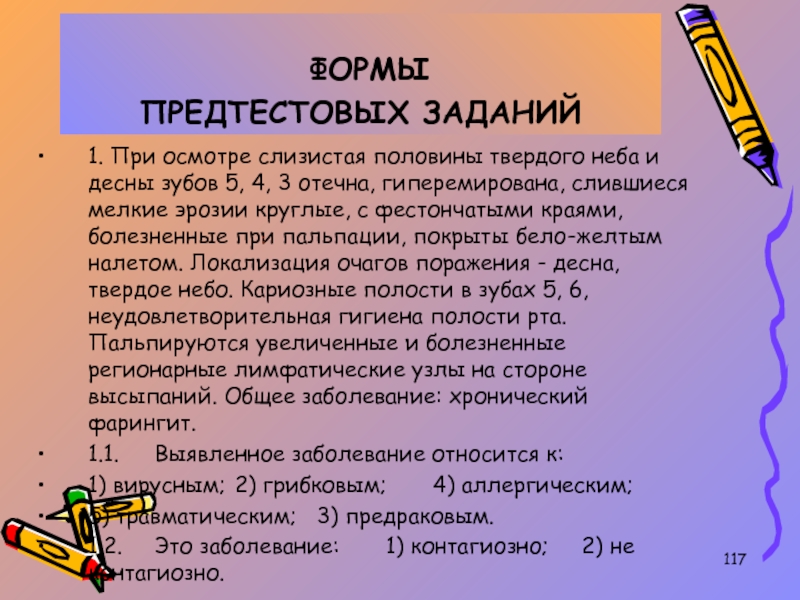 зубов 5, 4, 3 отечна, гиперемирована, слившиеся мелкие эрозии круглые, с фестончатыми краями, болезненные при пальпации, покрыты бело-желтым налетом. Локализация очагов поражения - десна, твердое небо. Кариозные полости в зубах 5, 6, неудовлетворительная гигиена полости рта. Пальпируются увеличенные и болезненные регионарные лимфатические узлы на стороне высыпаний. Общее заболевание: хронический фарингит.