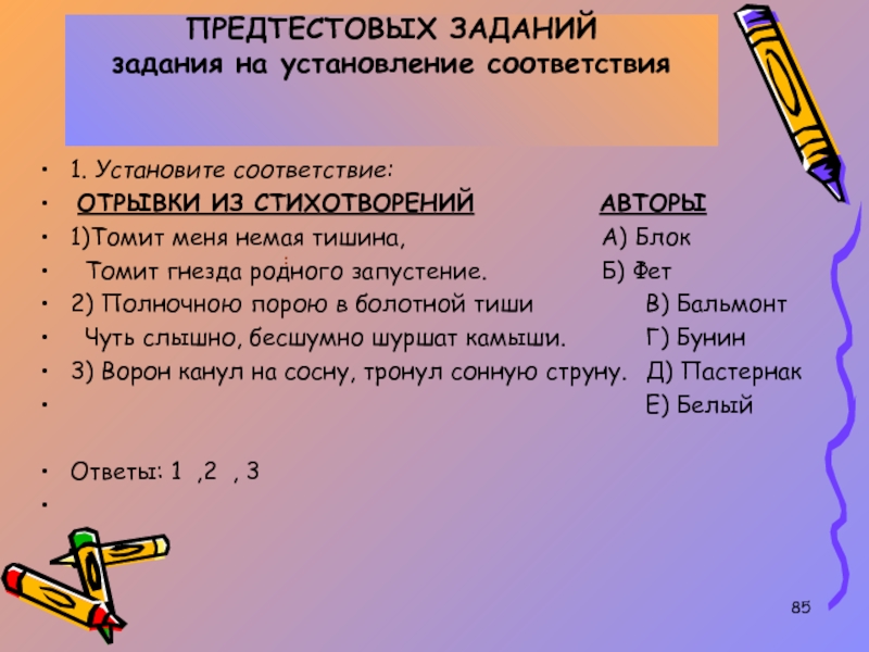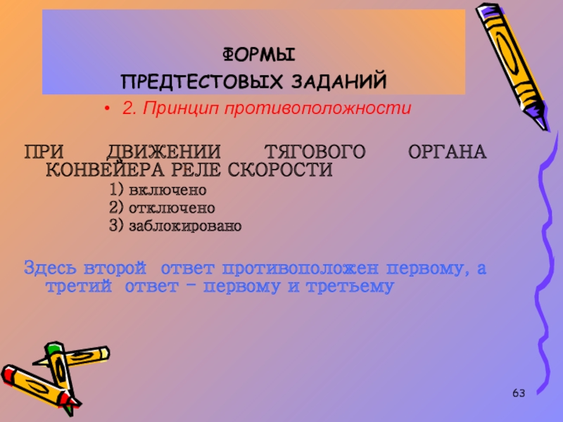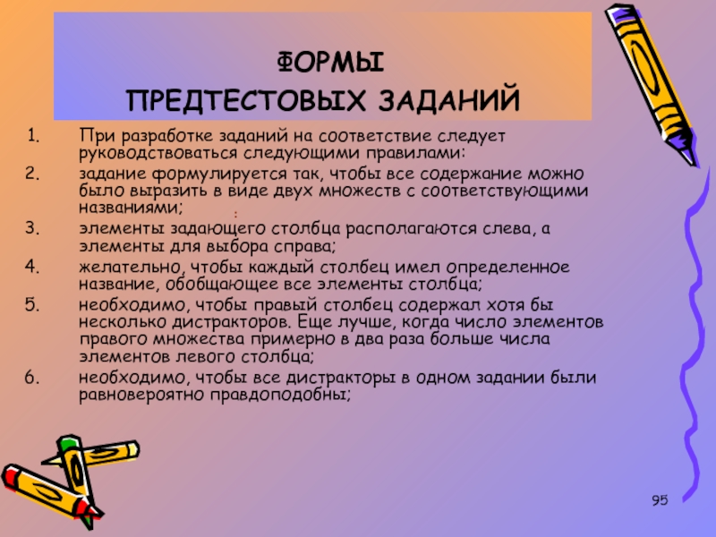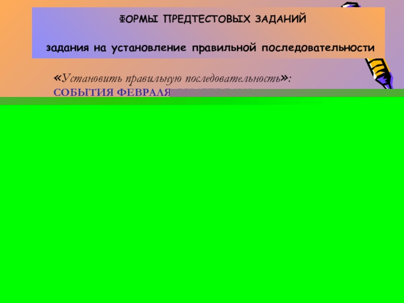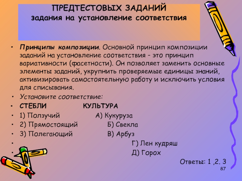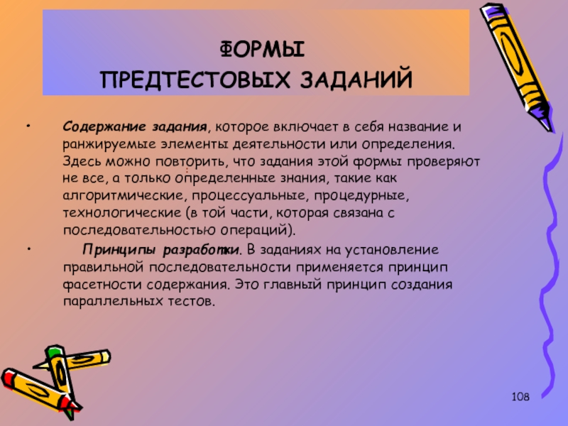 Принципы разработки. В заданиях на установление правильной последовательности применяется принцип фасетности содержания. Это главный принцип создания параллельных тестов.