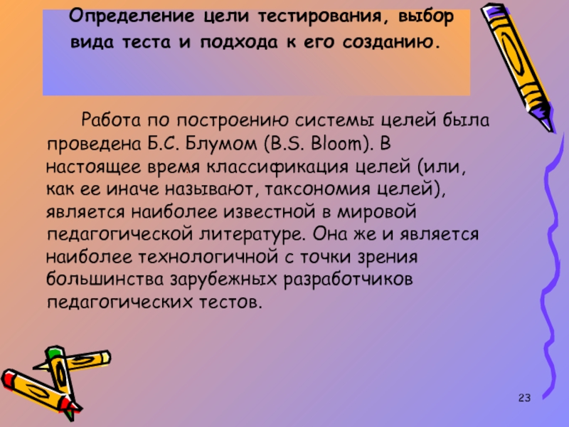 Слайд 23 Определение цели тестирования, выбор вида теста и подхода к его