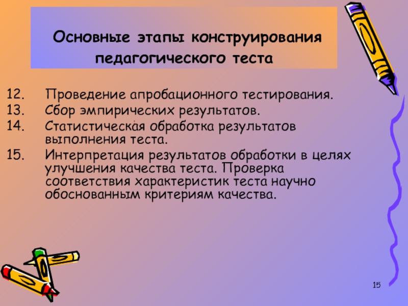 Слайд 14Основные этапы конструирования педагогического теста тестирования