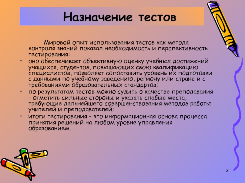 тесты. Однако в нашей стране только в начале 90-х годов тесты были официально признаны как достойное средство измерения (наряду с другими, традиционными), которое может быть использовано не только при текущем контроле знаний, но и при итоговой аттестации обучающихся во всех типах образовательных учреждений, что особенно важно для объективного контроля результатов образовательной деятельности как на заключительном, так и на промежуточных этапах обучения.