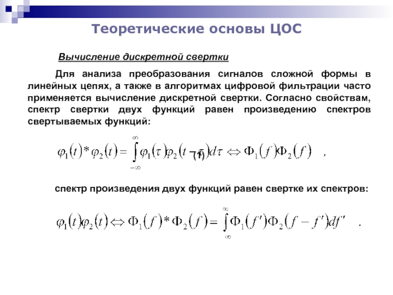 сложной формы в линейных цепях, а также в алгоритмах цифровой фильтрации часто применяется вычисление дискретной свертки. Согласно свойствам, спектр свертки двух функций равен произведению спектров свертываемых функций: