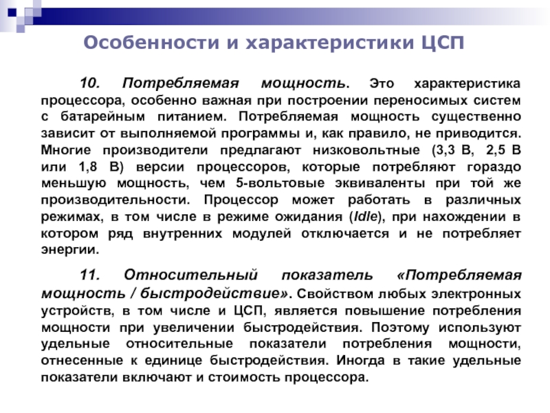 11. Относительный показатель «Потребляемая мощность / быстродействие». Свойством любых электронных устройств, в том числе и ЦСП, является повышение потребления мощности при увеличении быстродействия. Поэтому используют удельные относительные показатели потребления мощности, отнесенные к единице быстродействия. Иногда в такие удельные показатели включают и стоимость процессора.
