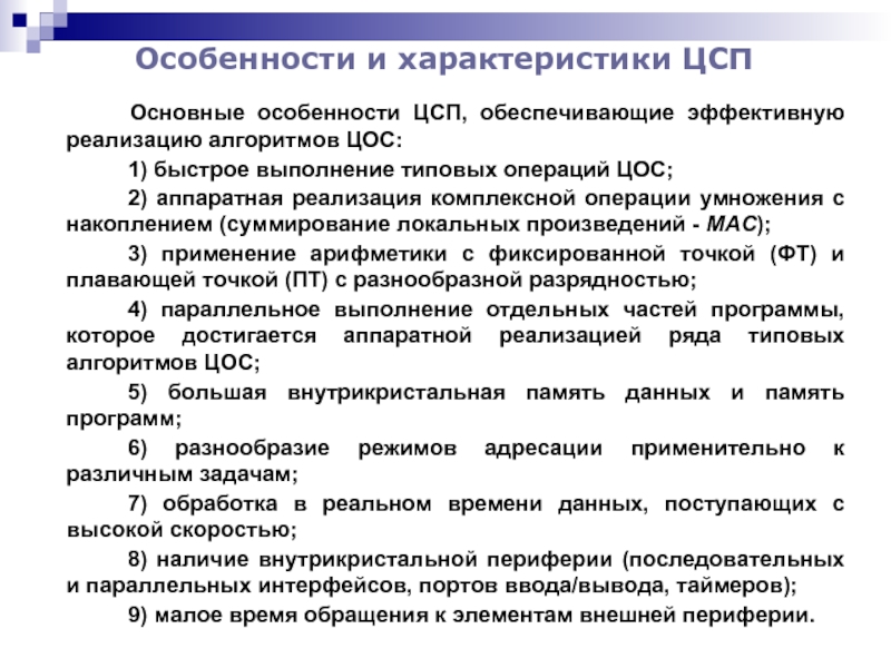 Основные особенности ЦСП, обеспечивающие эффективную реализацию алгоритмов ЦОС: