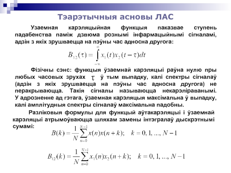 Разліковыя формулы для функцый аўтакарэляцыі і ўзаемнай карэляцыі атрымоўваюцца шляхам замены інтэгралаў дыскрэтнымі сумамі: