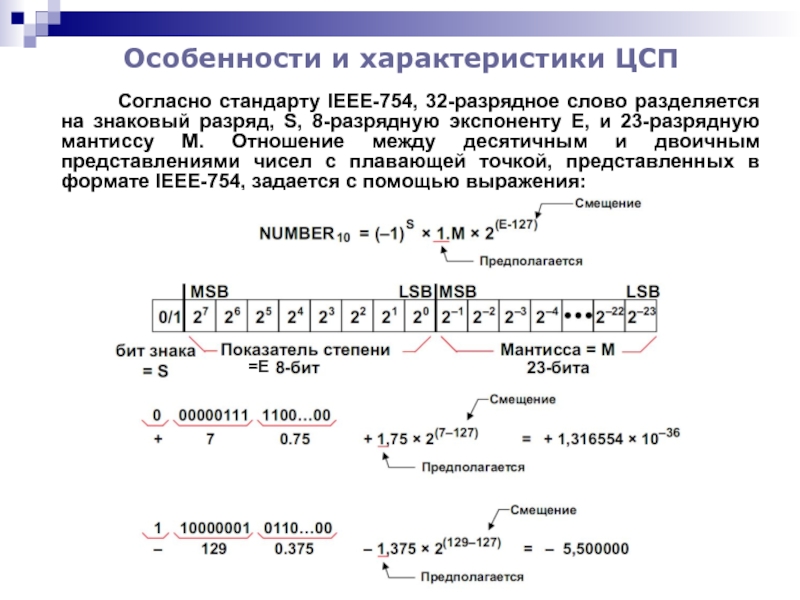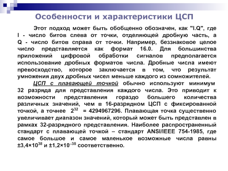 32 разряда для представления каждого числа. Это приводит к возможности представления гораздо большего количества различных значений, чем в 16-разрядном ЦСП с фиксированной точкой, а точнее 232 = 4294967296. Плавающая точка существенно увеличивает диапазон значений, который может быть представлен в рамках 32-разрядного представления. Наиболее распространенный стандарт с плавающей точкой – стандарт ANSI/IEEE 754-1985, где самое большое и самое маленькое возможные числа равны ±3,4×1038 и ±1,2×10–38 соответственно.