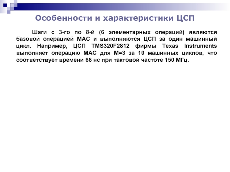MAC и выполняются ЦСП за один машинный цикл. Например, ЦСП TMS320F2812 фирмы Texas Instruments выполняет операцию MAC для M=3 за 10 машинных циклов, что соответствует времени 66 нс при тактовой частоте 150 МГц.