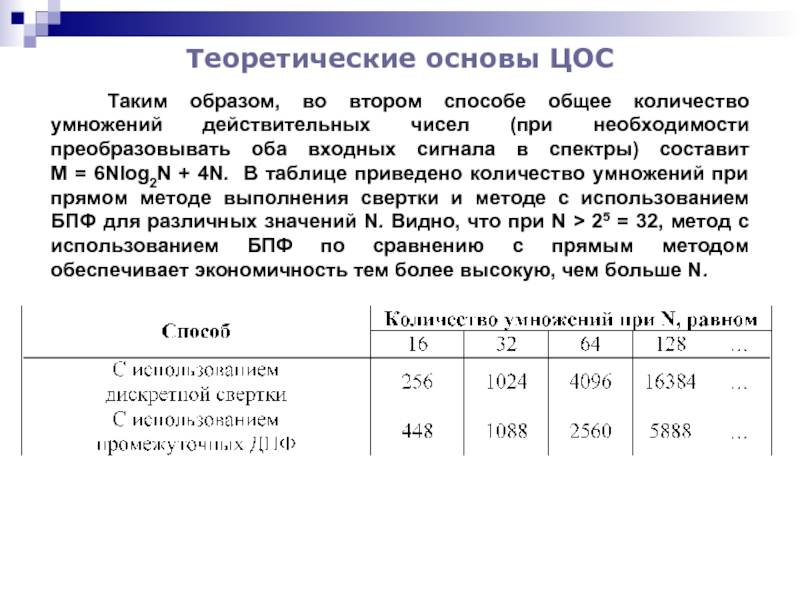 действительных чисел (при необходимости преобразовывать оба входных сигнала в спектры) составит М = 6Nlog2N + 4N. В таблице приведено количество умножений при прямом методе выполнения свертки и методе с использованием БПФ для различных значений N. Видно, что при N > 25 = 32, метод с использованием БПФ по сравнению с прямым методом обеспечивает экономичность тем более высокую, чем больше N.