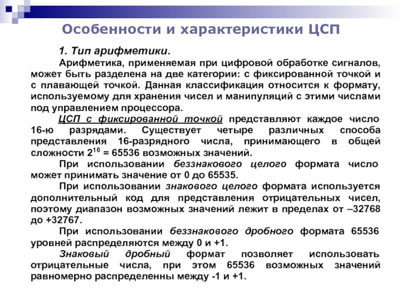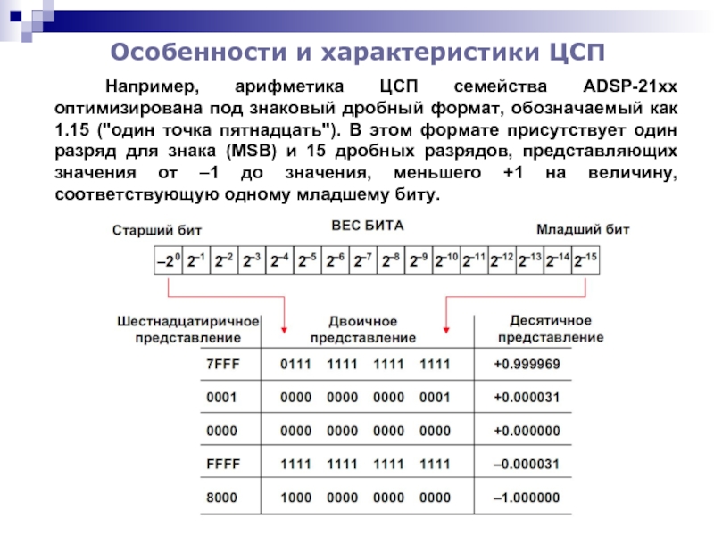 Например, арифметика ЦСП семейства ADSP-21xx оптимизирована под знаковый