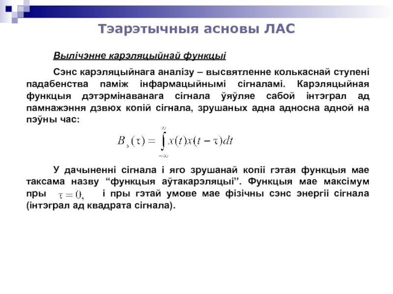 колькаснай ступені падабенства паміж інфармацыйнымі сігналамі. Карэляцыйная функцыя дэтэрмінаванага сігнала ўяўляе сабой інтэграл ад памнажэння дзвюх копій сігнала, зрушаных адна адносна адной на пэўны час: