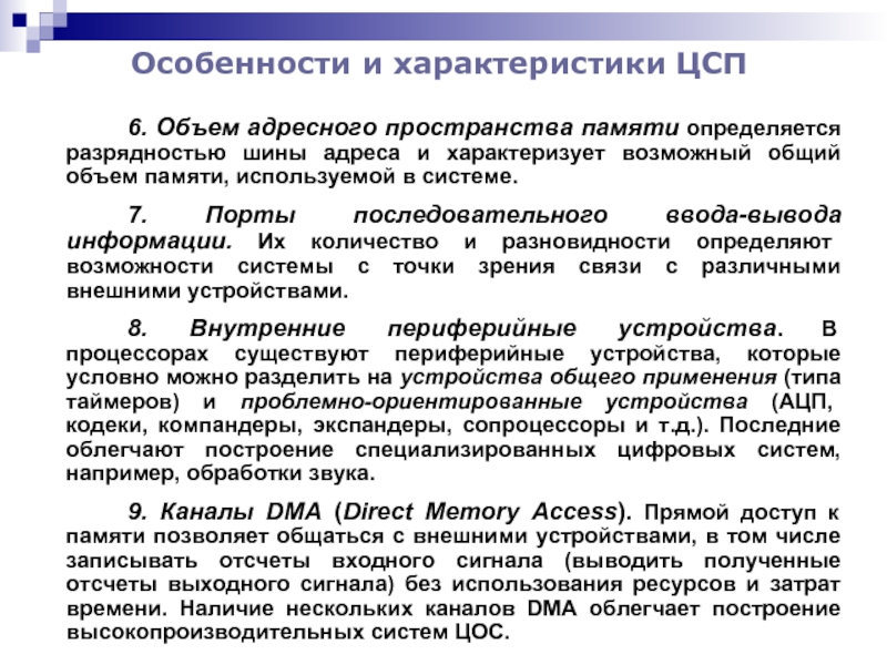 9. Каналы DMA (Direct Memory Access). Прямой доступ к памяти позволяет общаться с внешними устройствами, в том числе записывать отсчеты входного сигнала (выводить полученные отсчеты выходного сигнала) без использования ресурсов и затрат времени. Наличие нескольких каналов DMA облегчает построение высокопроизводительных систем ЦОС.
