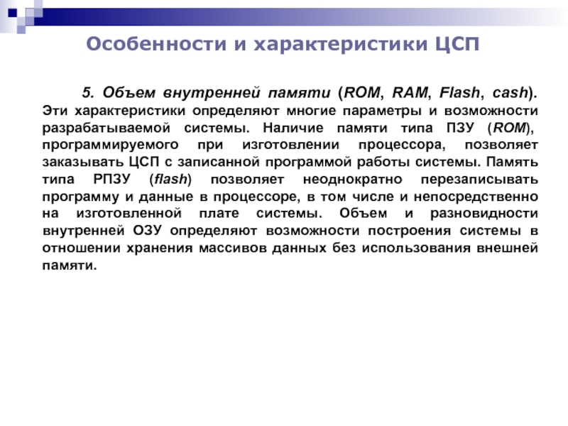 Эти характеристики определяют многие параметры и возможности разрабатываемой системы. Наличие памяти типа ПЗУ (ROM), программируемого при изготовлении процессора, позволяет заказывать ЦСП с записанной программой работы системы. Память типа РПЗУ (flash) позволяет неоднократно перезаписывать программу и данные в процессоре, в том числе и непосредственно на изготовленной плате системы. Объем и разновидности внутренней ОЗУ определяют возможности построения системы в отношении хранения массивов данных без использования внешней памяти.