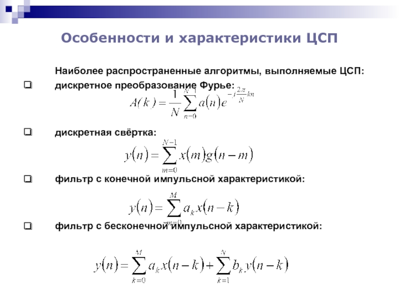 Слайд 22Наиболее распространенные алгоритмы, выполняемые ЦСП: