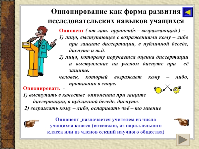1) выступать в качестве оппонента при защите диссертации, в публичной беседе, диспуте.