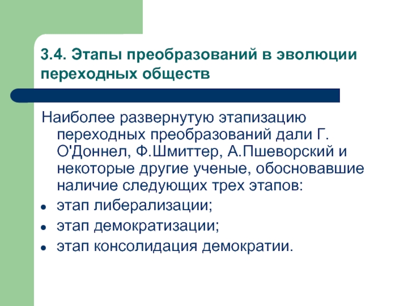 преобразований дали Г.О'Доннел, Ф.Шмиттер, А.Пшеворский и некоторые другие ученые, обосновавшие наличие следующих трех этапов: